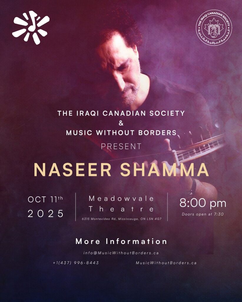 The Iraqi Canadian Society, in collaboration with Music Without Borders and as part of the Iraqi Festival of Toronto, proudly presents world-renowned oud virtuoso Naseer Shamma. A UNESCO Artist for Peace and one of the most influential figures in Arabic music, Shamma will perform on October 11, 2025, in Mississauga with an 8-member ensemble of the Toronto Arab Orchestra, conducted by Gaby Al Botros.